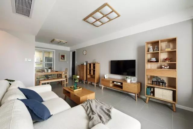 ▲虽然没有玄关,所以在进门的右手边摆放了一个成品矮鞋柜,餐边柜、电视柜,书柜都沿着这个墙面摆放,组成了一排美观与实用并存的收纳柜组合。