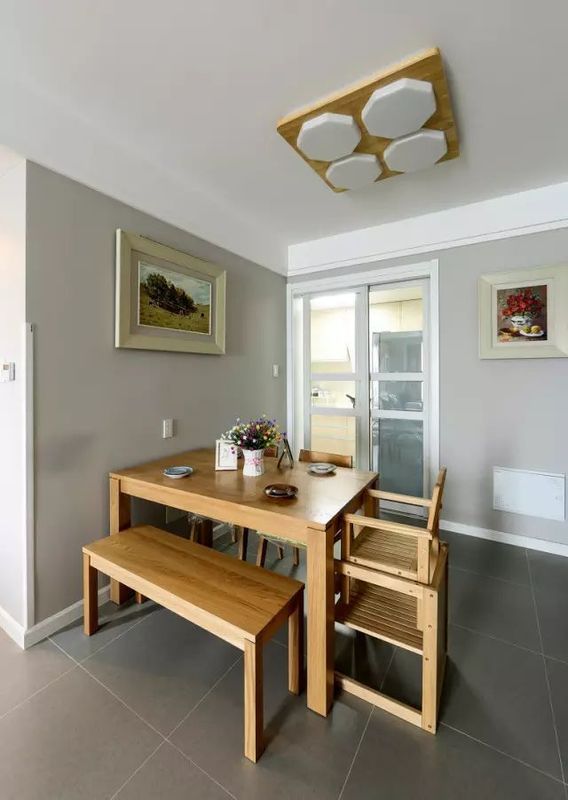 ▲由于面积有限,所以餐桌只能靠墙摆放,留出过道的空间。天花板上的吸顶灯是老婆在网上买的,和家里整体风格超搭。