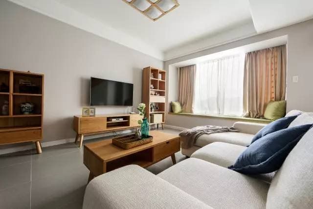 ▲电视背景墙刷成淡淡的灰色,没有做任何造型,简单地摆放了木色电视柜。
