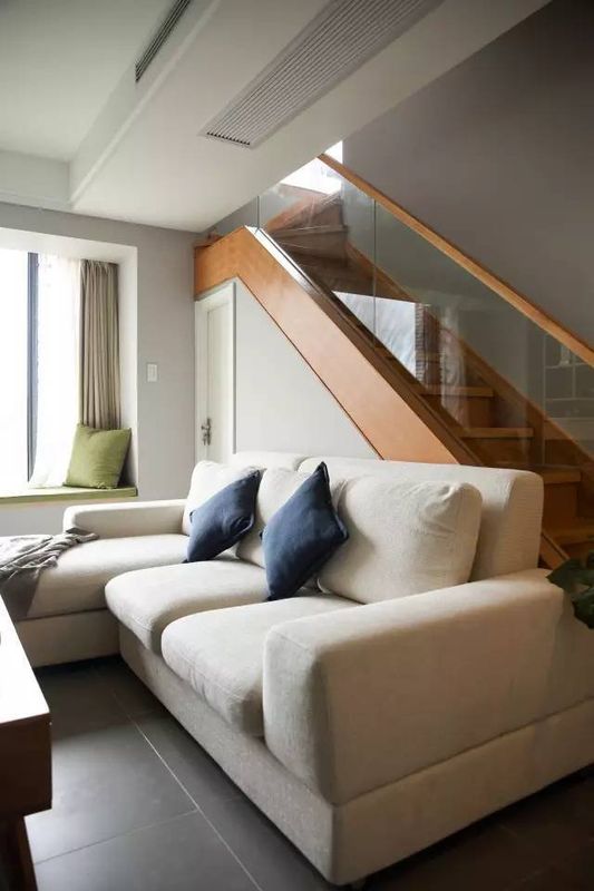 ▲沙发背景墙是通往二楼的楼梯。上面就是赠送的顶层露台,只有6~7平方的大小。