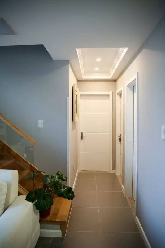▲楼梯口的顶面过道做了简单的吊顶,四边角用石膏线包住,做出来的效果很棒。