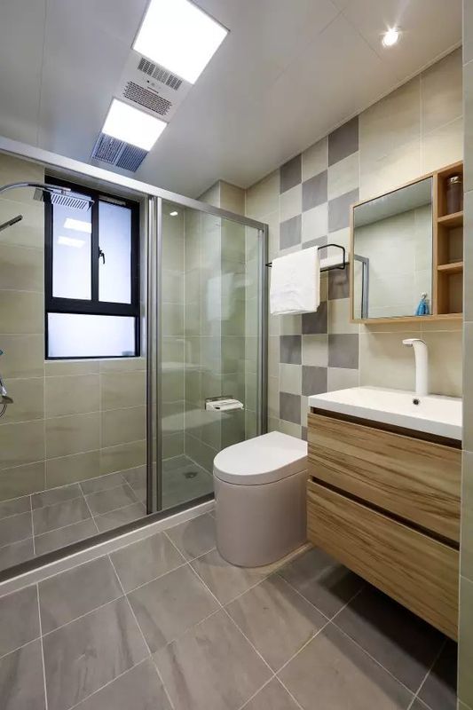 ▲卫生间做好了干湿分离,带有储物功能的镜柜,满足了日常收纳需求。马桶背面采用了两种颜色的墙砖拼接,以此来分隔空间,让整体看起来更有层次感。