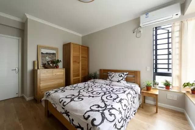 ▲主卧色调同样是以浅灰色为主,搭配木色的床和精心挑选的浅粉色格子床单,一切从简。