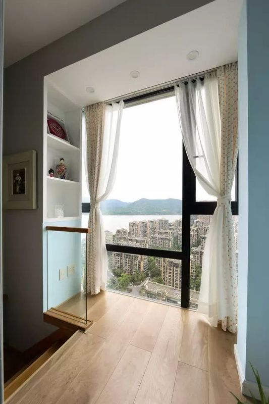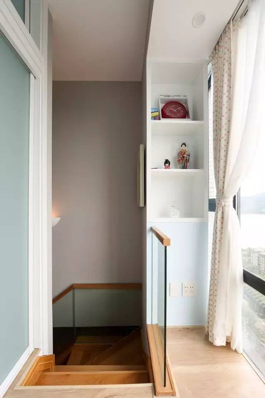 ▲上到二楼楼梯口,左手边即是一面大的落地窗,窗外风景尽收眼底。在楼梯口做了个小小的展示柜,平时可以放上一些装饰品、玩具手办、或者旅游带回来的展览纪念品。
