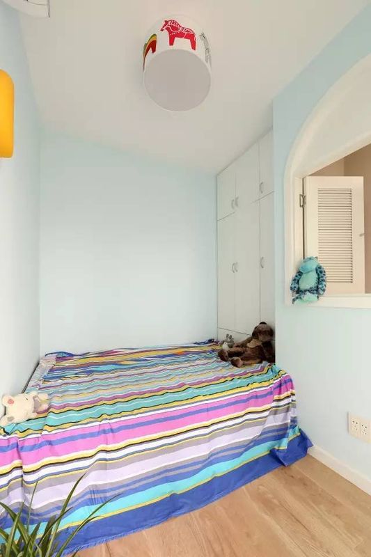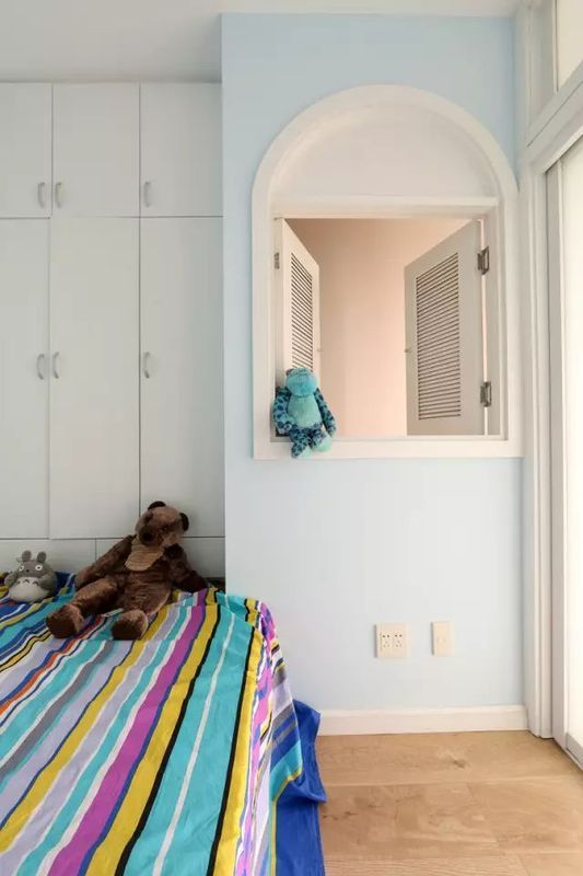 ▲床上放着龙猫、大棕熊、小兔子毛绒玩具,并在一面墙壁上设计了一扇拱形窗,蓝色的怪物萨利坐在窗沿上,让儿童房更接近动画片里的美好。