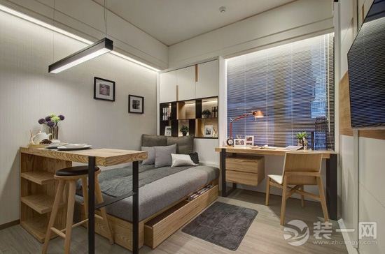 零居室的面积通常都比较小,这时,有效的规划功能区就成了一个很棘手的问题,常常是有了厨房没有卧室,有了卧室没有休闲区,无论怎么分割,都觉得面积还是太小了,“装”不下这么多功能区。设计师郜梓一设想,要是能将一个功能区“吊”起来,把整个房间立体利用起来,那么就不愁空间小、功能区无法合理利用的问题。