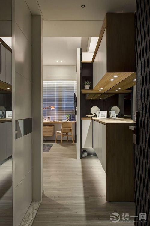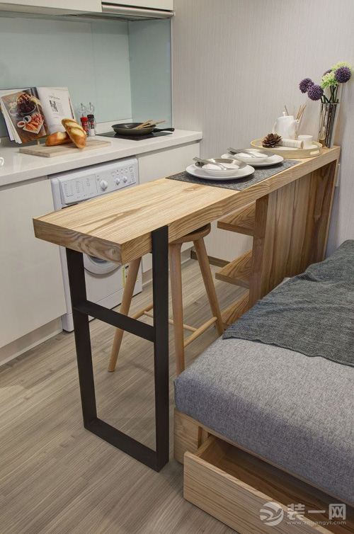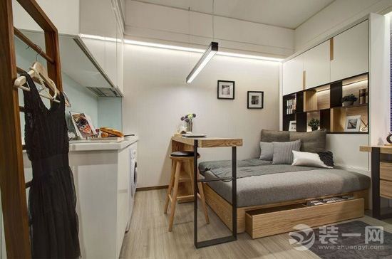 零居室所面向的客群一般都是白领阶层,对于生活品质有一定要求,但却不会经常开火做饭。因此,这种情况下,开间的厨房通常都设计成开放式,其居住特点就是轻油烟,甚至无油烟。考虑到这一点,厨房就不必加以封闭或者隔离开来,设计师在设计厨房壁柜的时候想到,若是将壁柜延伸,甚至可以制作出床体来。