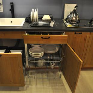其实,不管空间大小,橱柜内部是最需要好好规划的,否则就造成空间的空置。比方说,下部的橱柜可以空出一块来放锅具,上部橱柜也可以利用隔板或抽屉,将杯子、碗、壶都分类摆放,最下层隔间还可以放小家电。