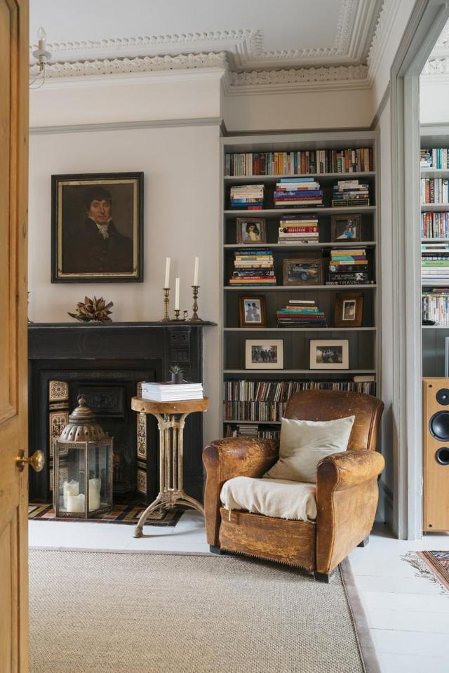 穿过厨房就是客厅了,这儿的风格完全不一样,有种维多利亚风格的特色,不仅有壁炉可以取暖,还有一个很大的书架,上面摆满了各种各样的书,每个空间利用得都还算充分。