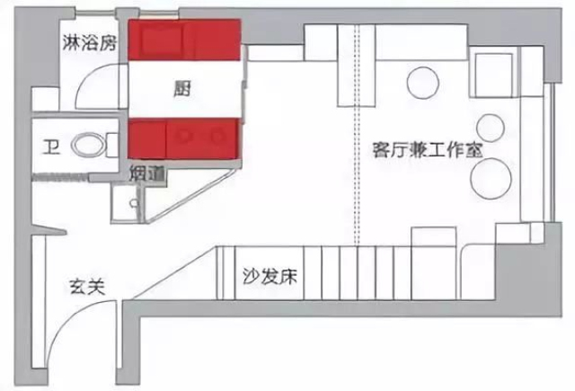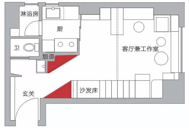 凹角的下方朝向卫生间的位置,放扫帚等杂物,这样设置也很符合人体工学设置。