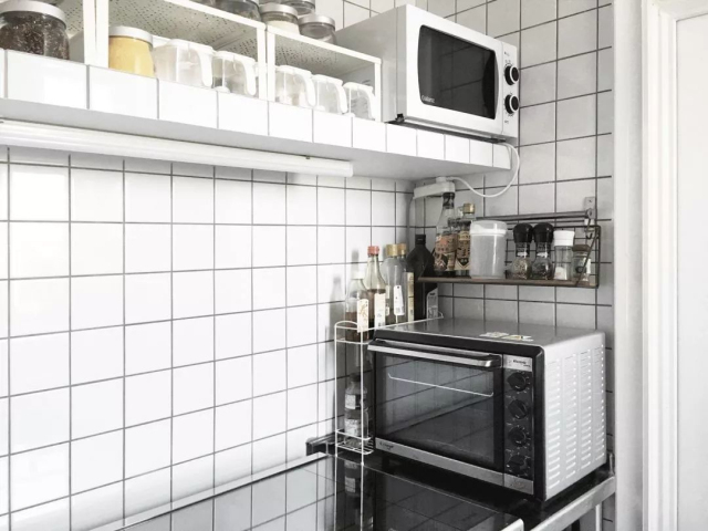 微波炉及各式瓶瓶罐罐被整齐排列,不用弯腰和转身便可随时取用。
