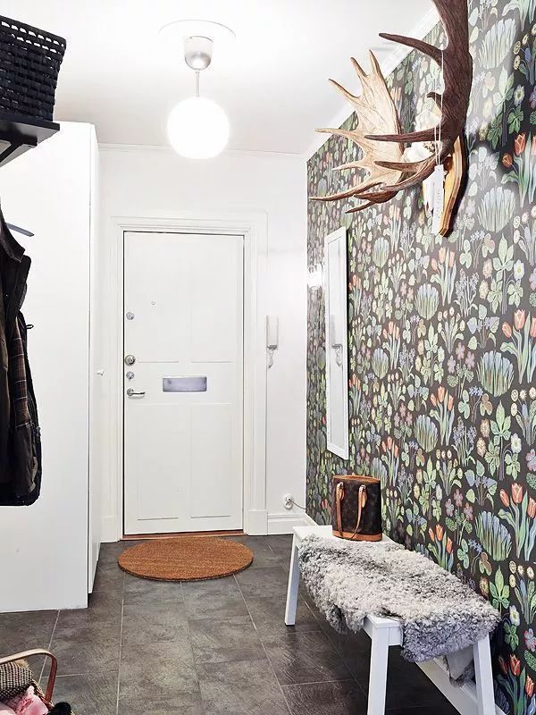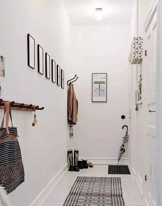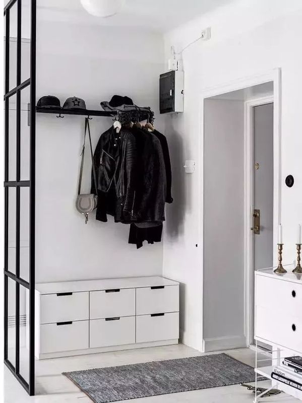 回家后换下的帽子、外套、围巾、包包没地方放?在玄关处放一个简洁的衣帽架,这些配件就不用随处乱扔了。或者在墙上打上挂钩,也能解决。